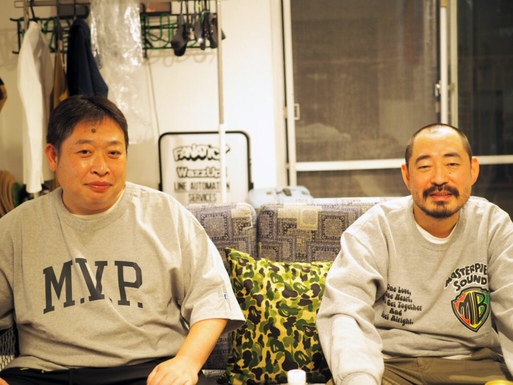 現在はセレクトショップ、A-1 CLOTHING を展開し、レゲエサウンド、MASTERPIECE のセレクターとしてはもちろんのこと、レゲエのみならず幅広いジャンルで活躍する真柄尚武さん( 右 )と、《あんとき》に HECTIC で MASTERPIECE の生産を担当し、現在はオートバックスにて JACK & MARIE などのライフスタイル事業のECを統括している Bootura さんこと吉﨑豪さん( 左 )