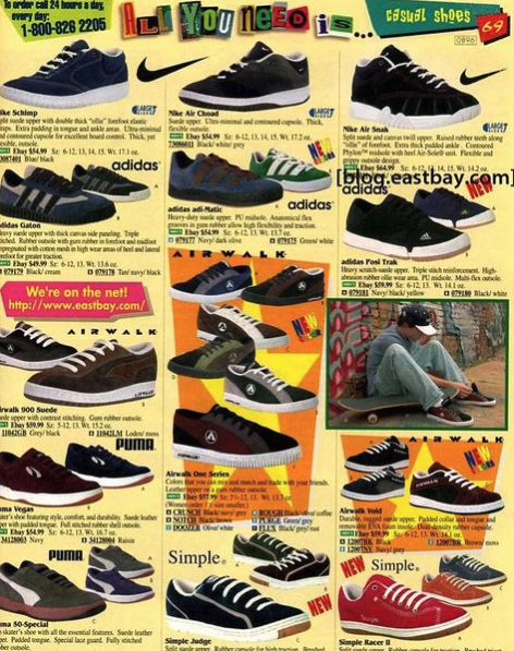 これは Foot Locker( フットロッカー )の子会社で、スニーカーのカタログ通販の大手だった Eastbay( イーストベイ )の当時のページなんですが、VANS や AIR WALK なんかと一緒に NIKE や adidas、PUMA や CONVERSE のスケシューが売られています