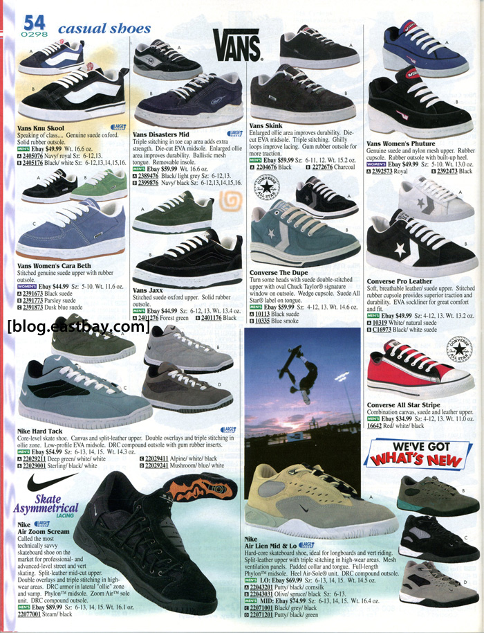 これは Foot Locker( フットロッカー )の子会社で、スニーカーのカタログ通販の大手だった Eastbay( イーストベイ )の当時のページなんですが、VANS や AIR WALK なんかと一緒に NIKE や adidas、PUMA や CONVERSE のスケシューが売られています