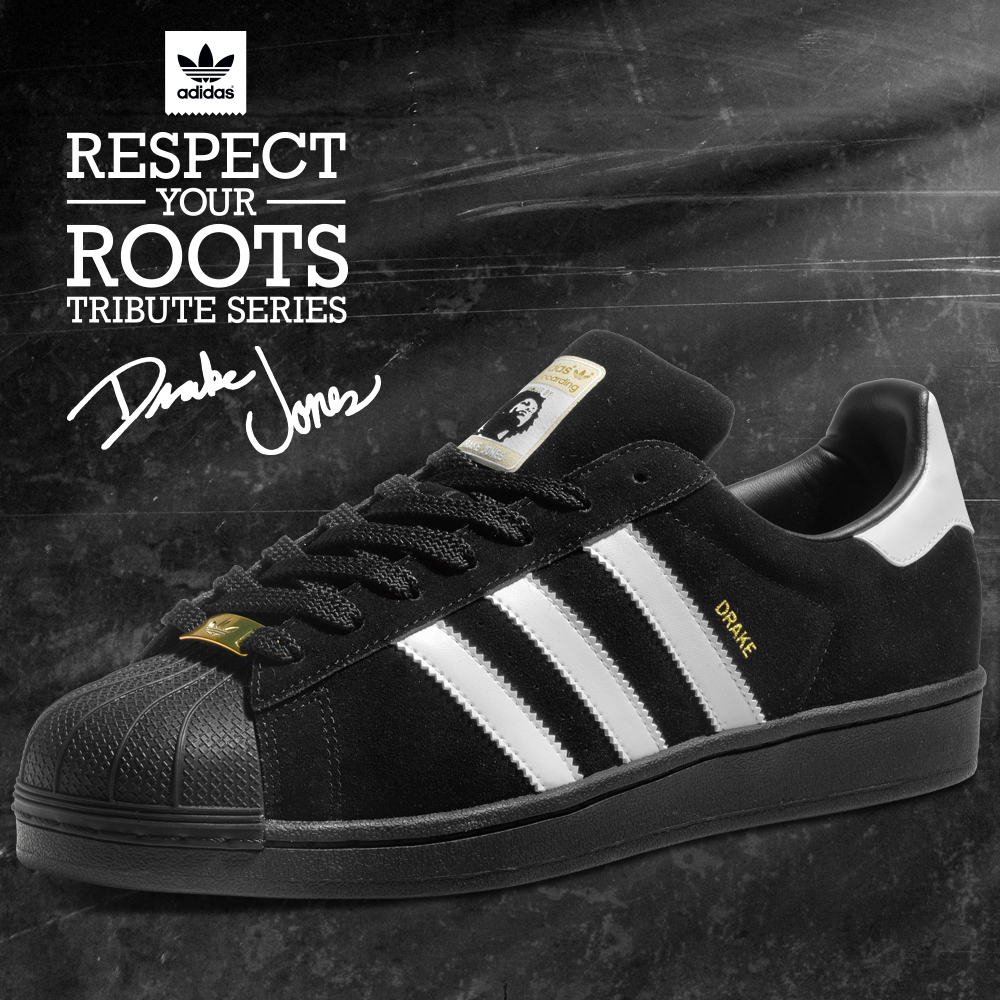 “RESPECT YOUR ROOTS” の第2弾としてリリースされた SUPER STAR RT-DRAKE は、スケートシーンに SUPER STAR を広めたレジェンドとしてドレイクに敬意を払い、リリースされたモデル( 画像参照元:adidas )