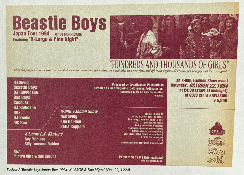 ’94年に行われた Beastie Boys の伝説の来日公演( @クラブチッタ川崎 )には GAS BOYS も招集された。写真はXLARGE 25周年ヒストリーブックに掲載された当時のフライヤーより