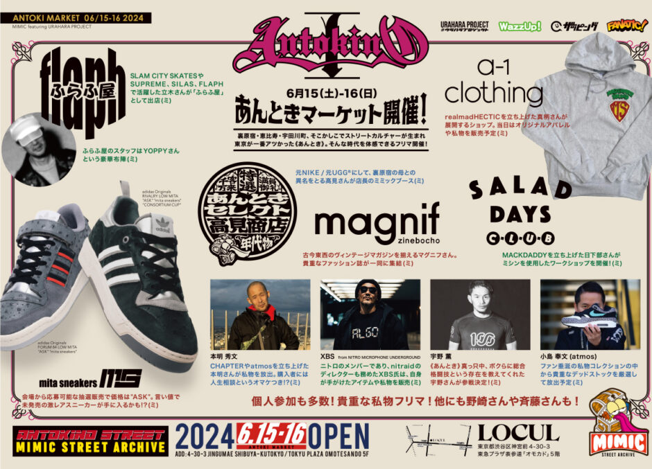 名前の通り、コンセプトは《 あんとき 》。裏原宿・恵比寿・宇田川町といった、東京のそこかしこでストリートカルチャーが生まれ、東京が一番アツかった《 あんとき 》を体感できるフリマイベント。参加してくれるのは、もちろん《 あんとき 》を作り上げてきたブランド・ショップ・そして個人の方々。