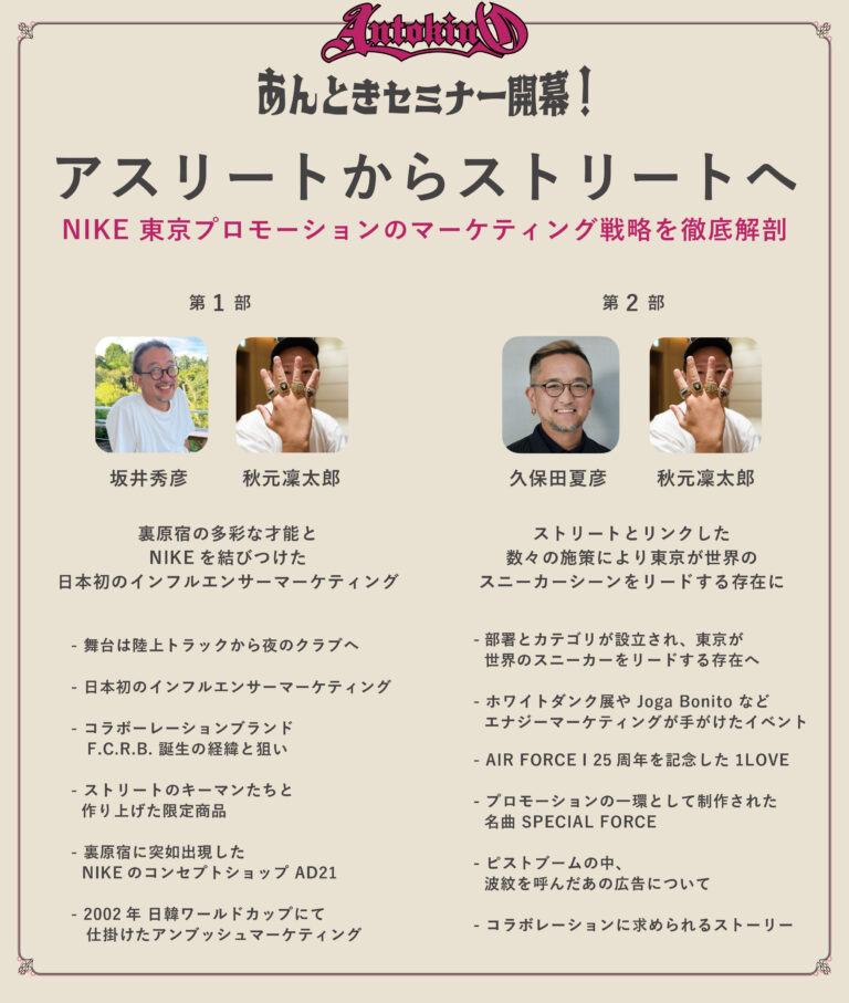 記念すべき第1回目となる今回のセミナーでは、数々の伝説的な施策によって東京をスニーカーの中心地に変えた NIKE 東京プロモーションに焦点を当てました。