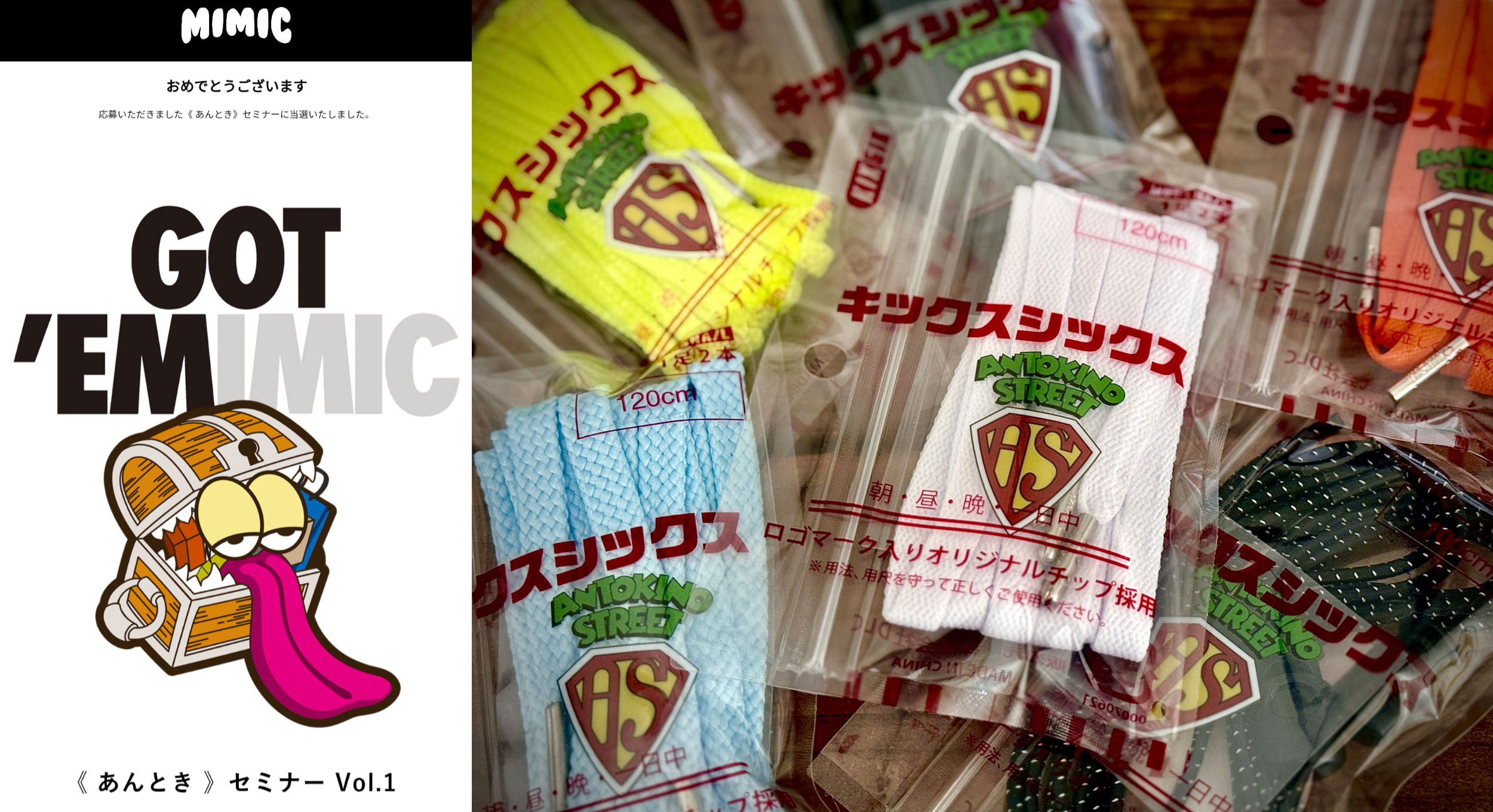 ( 左 ) 今回のセミナーは抽選制で、当選した方のみが参加いただける形式とさせていただきました。当選者にはミミックらしい遊び心のあるお知らせが ( 右 ) 参加者全員に KIX SIX さんより提供いただいたシューレースも配布させていただきました