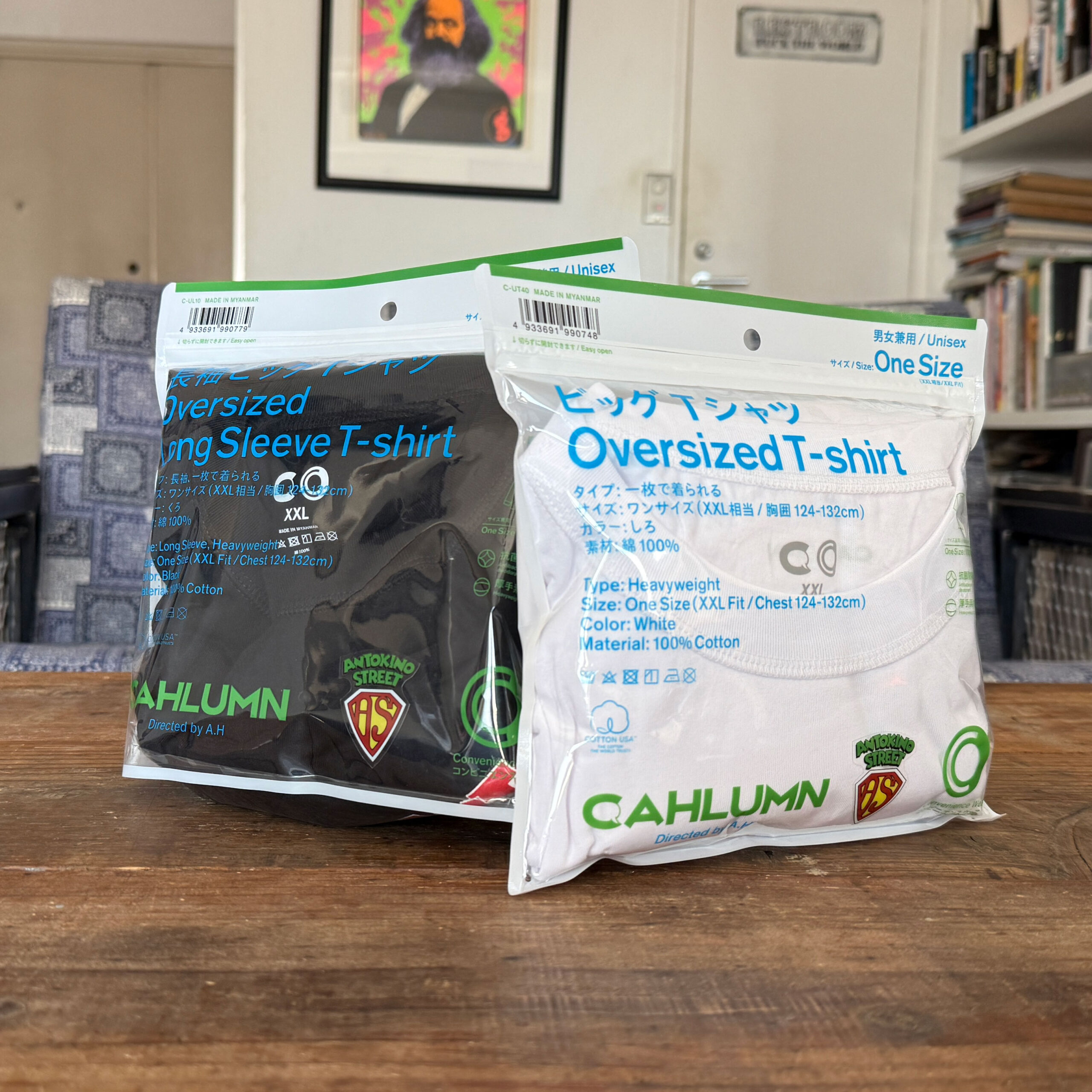 今回ボディとして使用したのは、スタイリスト長谷川昭雄さんのブランド「 CAHLUMN 」 とファミリーマートのオリジナルアパレルブランド「 コンビニエンスウェア 」のコラボレートによって、8月に発売されたビッグシルエットTシャツ。昭雄さんが《 あんとき 》Tシャツを気に入ってくれたので、せっかくならということでボディに使用させていただきました。