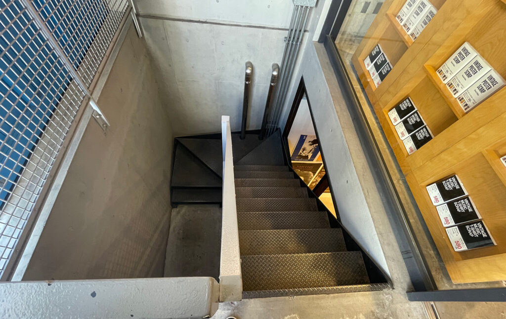 この階段、やばいね。なんだろ階段が1番思い出がよみがえるという (笑)。この階段のコンクリ打ちっぱなしの部分には、 KAWS ( カウズ ) の絵がかかってたよね。今考えると、外に飾ってあったわけでしょ !? スゴい時代だよね、まぁでも出自がグラフィティである以上、それが正しくもあるんだろうけど