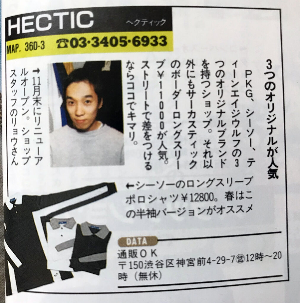 PKG ( ピーケージー ) や SEESAW ( シーソー ) といったオリジナルブランドを手がけていた頃のヘック。ショップスタッフとして紹介されているのは KRYPTON ( クリプトン ) を手がけ、現在は ZEPTEPI ( ゼプテピ ) のデザイナーとして活躍する RYO さん