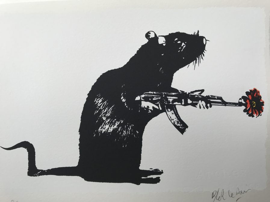 そうだね。代表作の「風船と少女」が2002年。ネズミのモチーフは2003年からで、その頃にもう1つの代表作「フラワースロー」が生まれ、中頃にはまたパレスチナの壁に作品を残すんだけどそれも話題になったよね