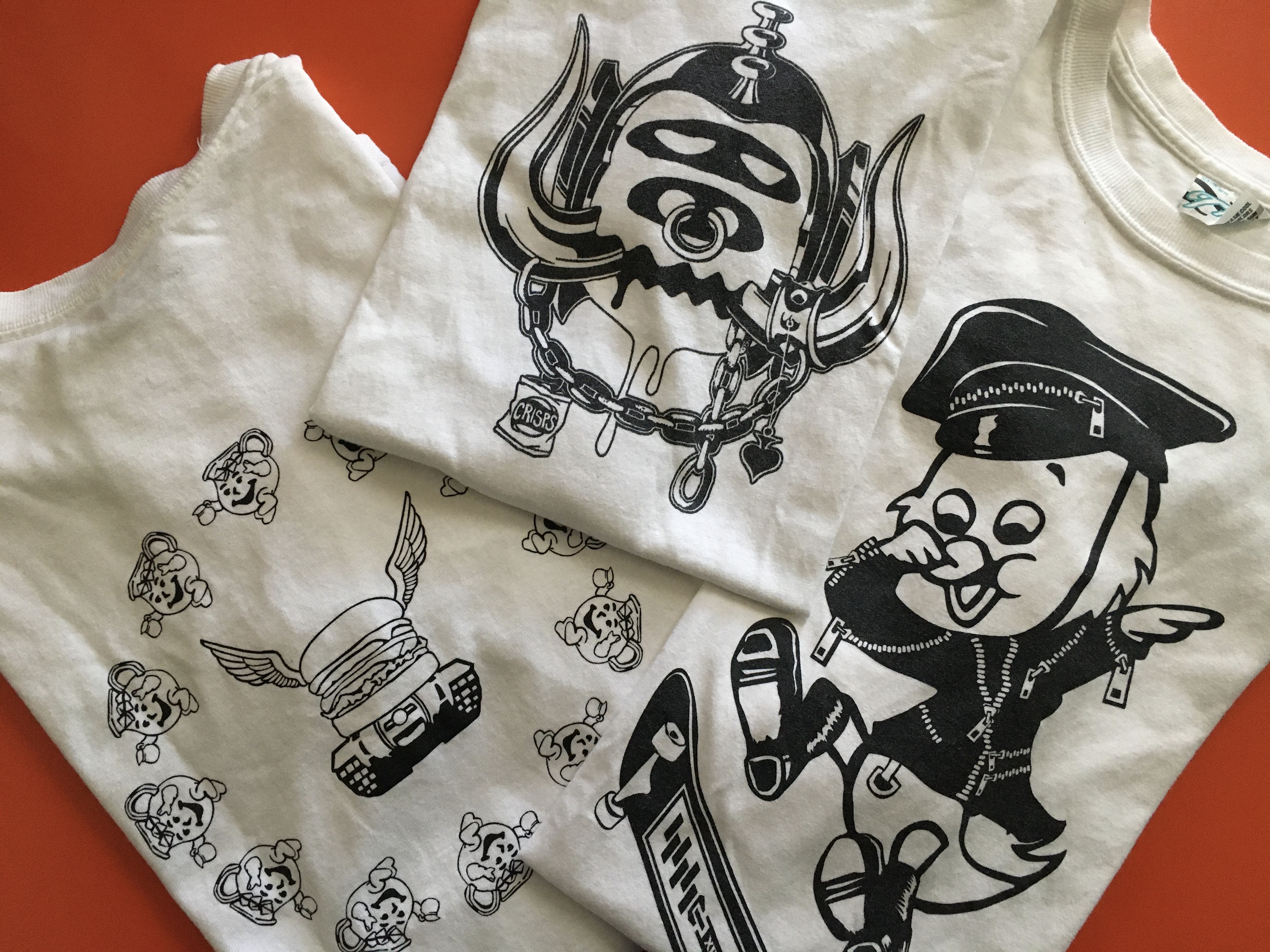 白Tにスミ1色のプリントTeeはカッコいい。つーか、デザインとかプリントサイズとかレイアウトとか…そういうのをひっくるめたトータルでのセンスが極めて優秀でないと、ただの安っちいダサTeeになっちゃうから、カッコイイものにするには、かなりのレベルを要するんよね。となると、やっぱしT19がダントツ。そんでCFでおなじみのヘラ(モーターヘッドバージョン!!)はもちろんKIZMさん。
