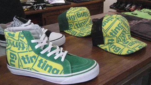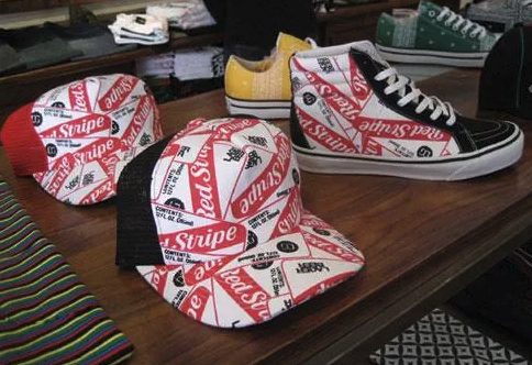 これはボクが MAD FOOT! ( マッドフット!) に在籍していた時代の話なんだけど、当時マスターピース別注でレッドストライプというビール、ティンというジュースのラベルをモチーフにした柄でスニーカーを作る話があったんですね