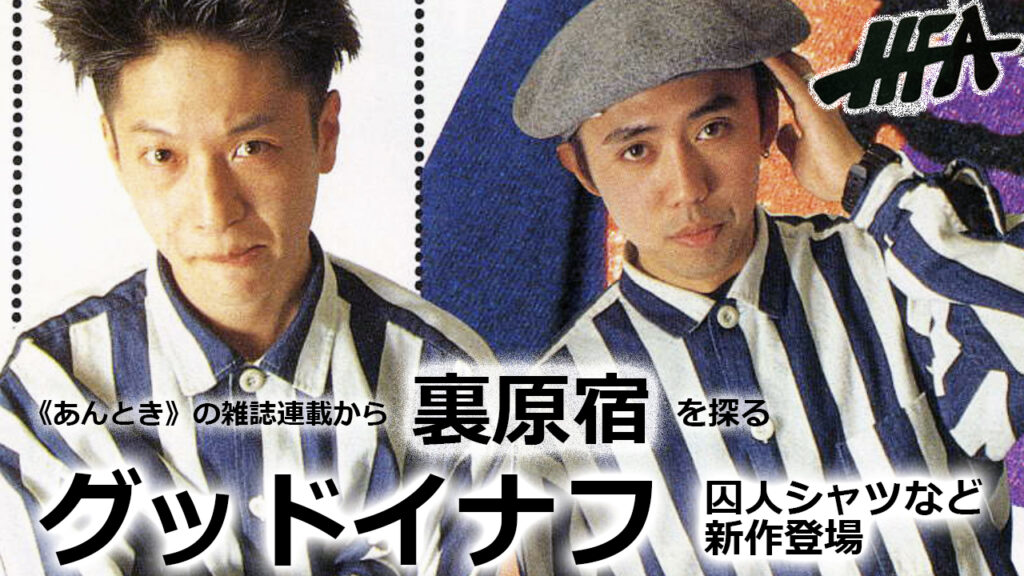高木完さんをゲストに迎え、タイニーパンクスの2人が揃ってお送りする HFA ‘91年 5月号。メインカットで着用しているのは GoodEnough ( グッドイナフ ) の囚人シャツで、元ネタはアルカトラズ刑務所のゴンズの1枚からじゃないか、という推測を YouTube ではしています。左ページには、グッドイナフの差別反対TシャツやグレッチTシャツが紹介されており、その後名品と語り継がれる商品が多数紹介されていた回となっています。