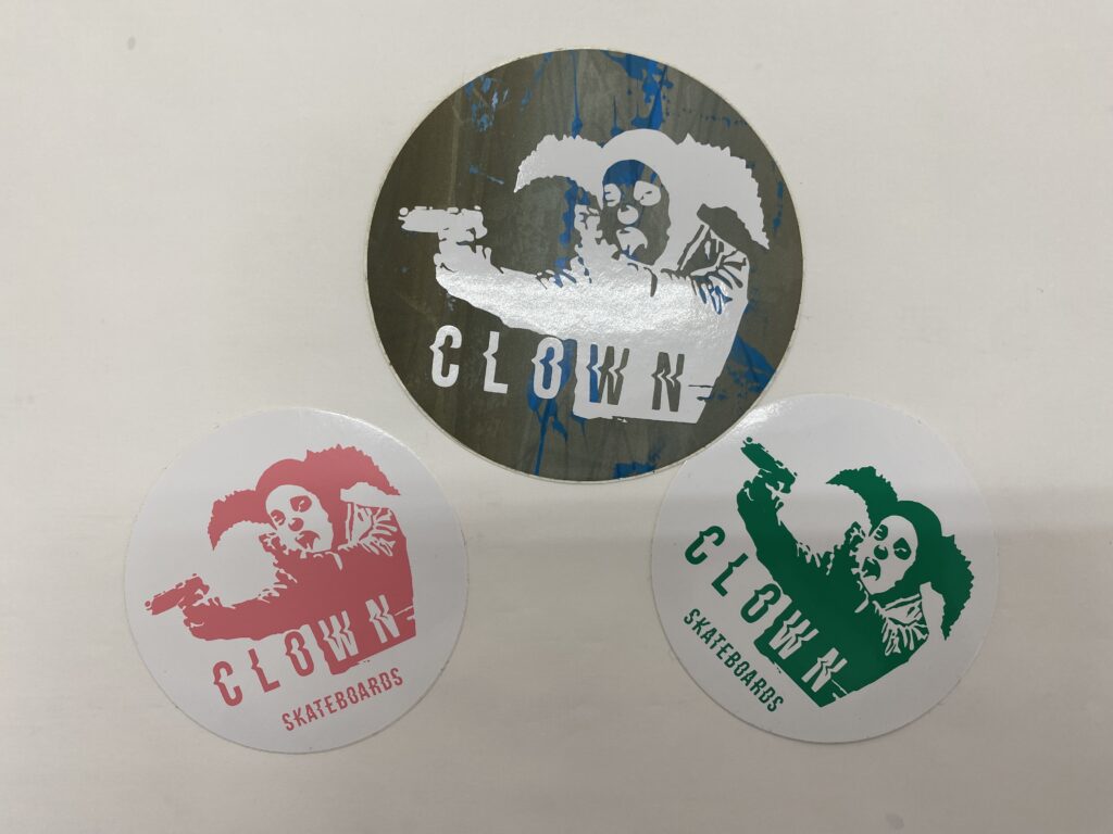 当時、ジェドが Insane Skate Supplies で取り扱っていた CLOWN SKATEBOARDS のロゴステッカー。グラフィックを担当したのは有名になる前のバンクシー