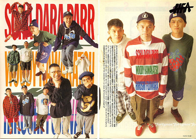続く、1991年3月号の「 HFA 」でもリコメンドされる insane。ゲストのスチャダラパーや藤原ヒロシさんたちが、ロンTやショートパンツなどを着こなしている。一緒に紹介されているのは、ANARCHIC ADJUSTMENT ( アナーキック・アジャストメント ) や HAZE ( ヘイズ ) といったブランド( 雑誌『 CUTIE 』より )