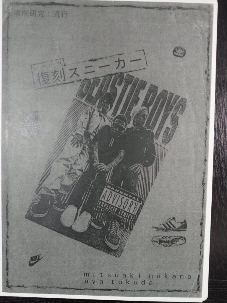 多分、当時メンバーの今井さんが働いていた上野のカネオカで撮られた写真だと思うのですが、僕は同じアメ横の山男フットギアにもよく通っていたんですよ。大学時代に入っていたマーケティングのゼミで、スニーカーをテーマにレポートを書くときも大変お世話になりました。これがそのときにワープロで作成したレポートなのですが