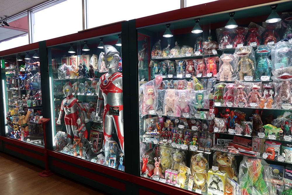 屋外駐車場に続く最上階の通路には、まんだらけばりの超・貴重な和モノ玩具たちがズラリ!ほ、欲しい…。
