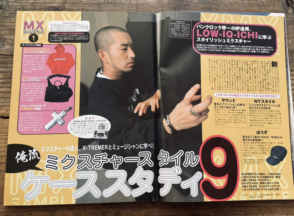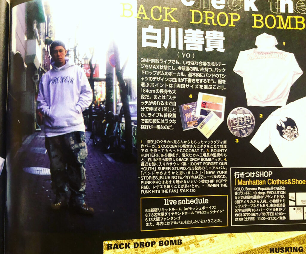 BOUNTYHUNTER のアイテムをオーバーサイズに着こなすというオリジナル・スタイルを確立してい たBACK DROP BOMB のタカ氏が MACKDADDY を紹介している当時の『 Ollie 』誌面 / 出典:Ollie