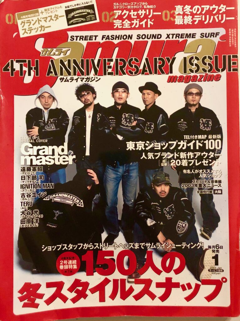 2004年に DEVILOCK が中心となったプロジェクト、Grand master で samurai の表紙を飾る。遠藤さん、日下部さん、ヒデボウイさん、エイジさん ( = GARINI )、TERUさん ( = AG )、大谷さん ( = bootlegbooth )、田原さん ( =MOBSTYLES ) と、恵比寿系と呼ばれたブランドのメンバーが勢揃い / 出典 : samurai