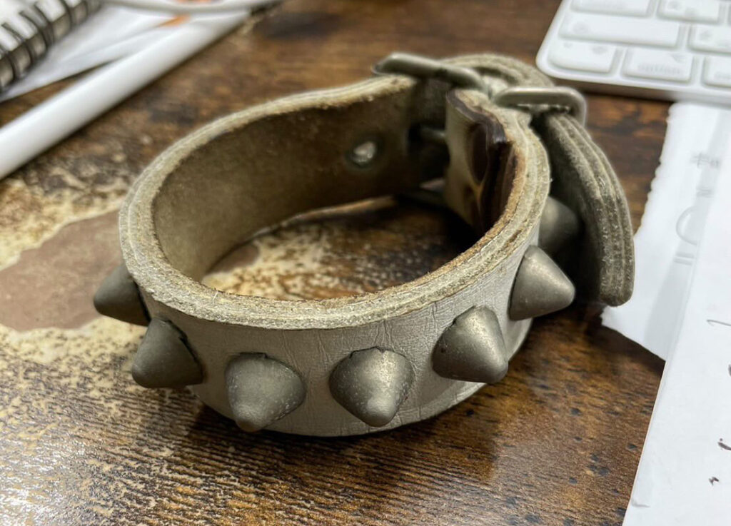 こちらは当時のリストバンドでグレーのレザーにスタッズを打ち込んだもの。ベージュっぽくも見える絶妙な色合いを選ぶあたり、日下部さんのこだわりを感じます