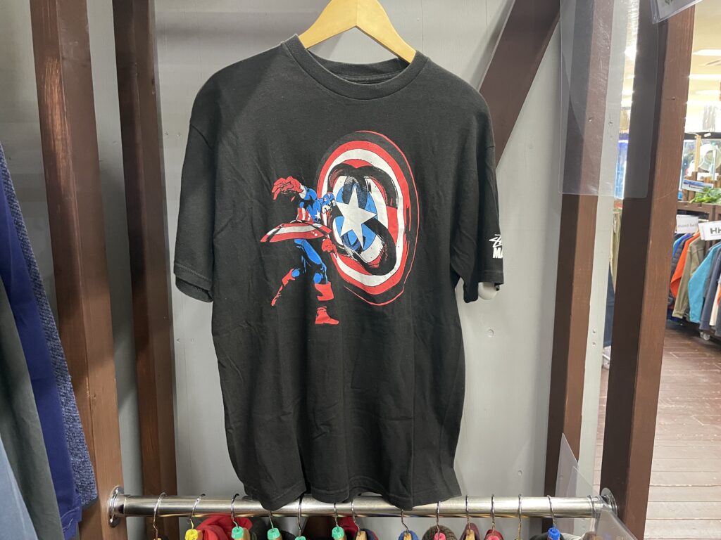 ステューシーとマーベルコミックのコラボTシャツ。コスタス風なんだけど、どうなんだろう?
