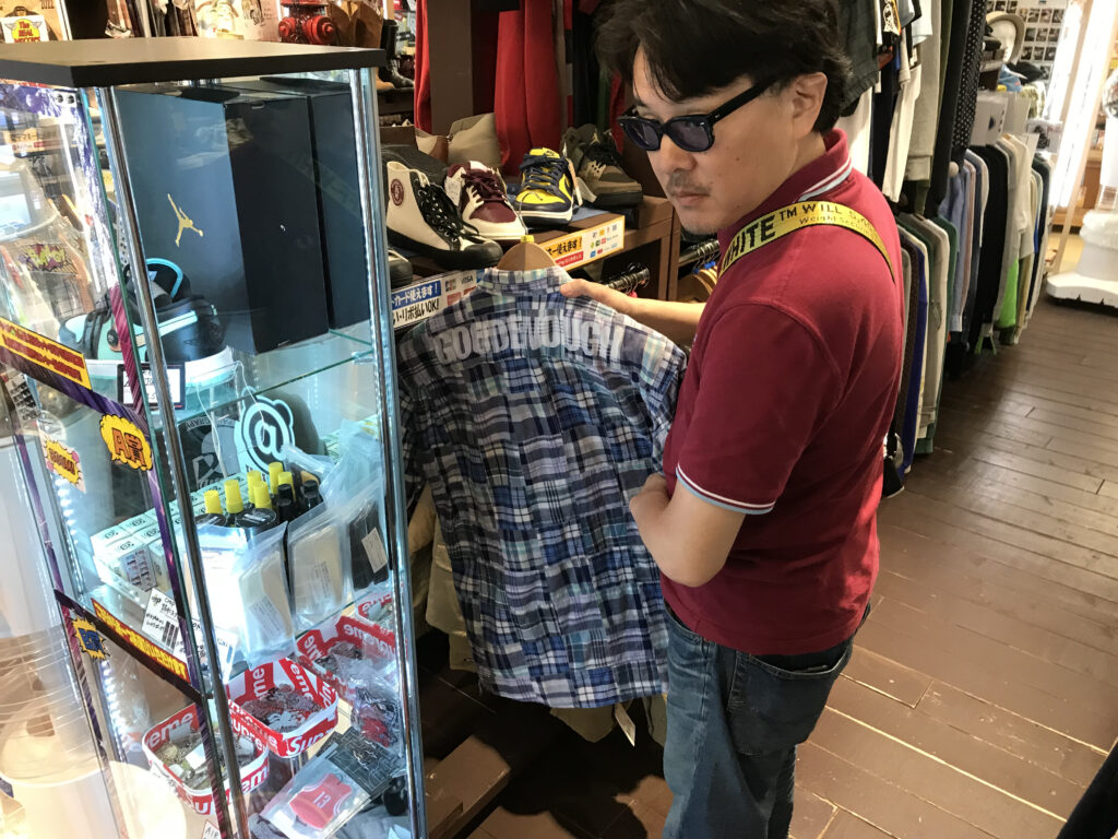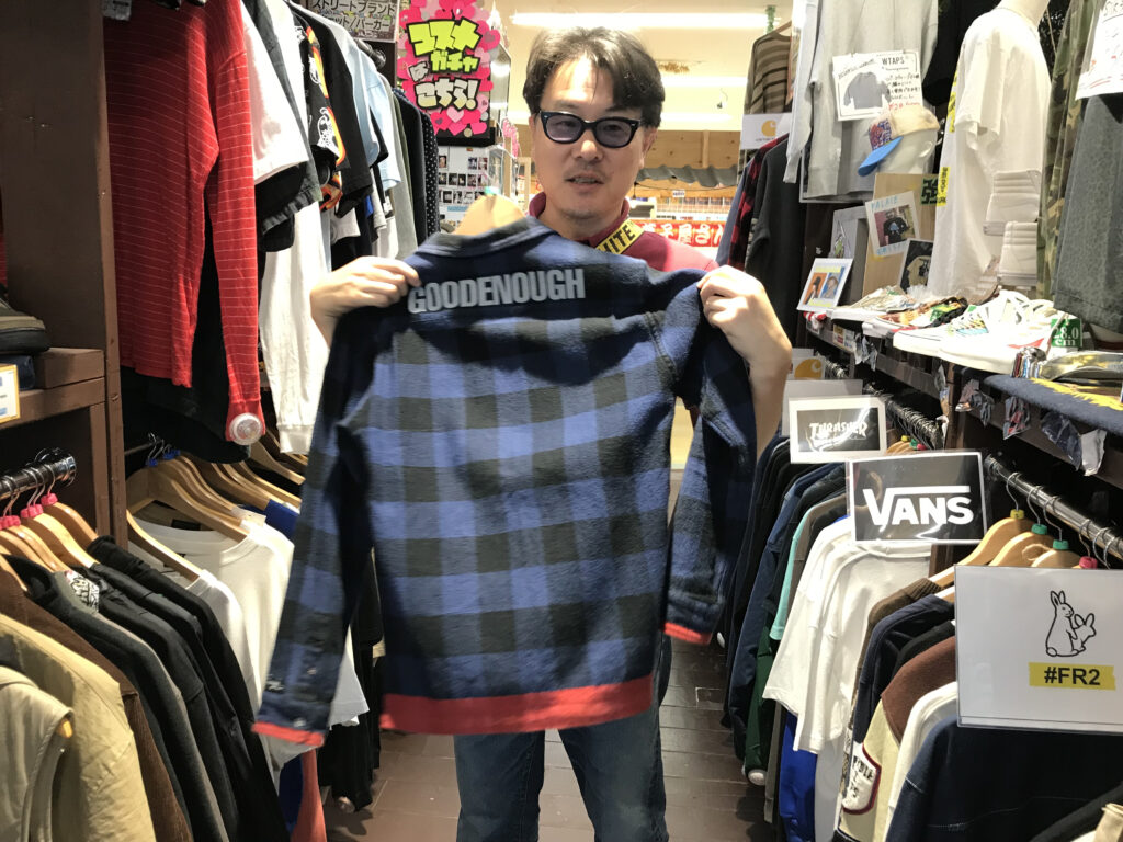 続いて発見されたのが、メンバーの野田が収集しているグッドイナフのライン・ネルシャツ。グッドイナフの名作のひとつに数えられ、藤原ヒロシさんもよく愛用していたイメージがあります。