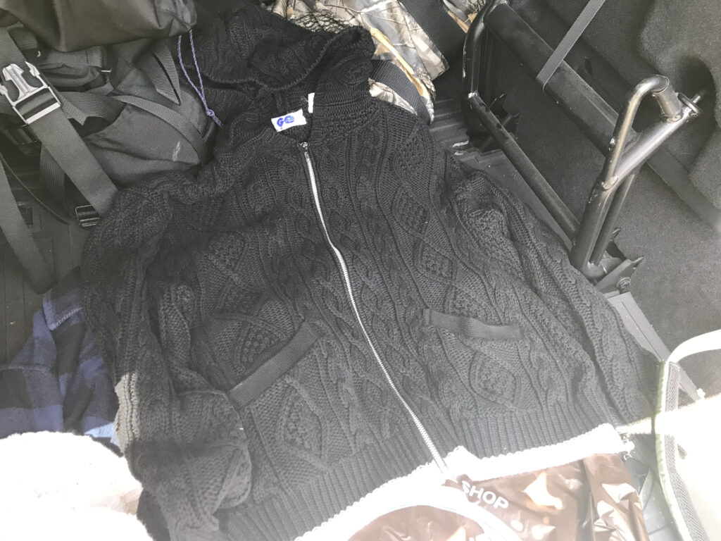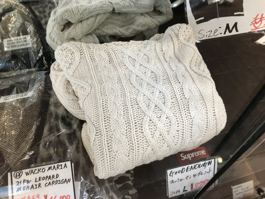 そして、我々に衝撃を与えたのが、ショーケースの中に鎮座していたグッドイナフを代表するアイテムのひとつ、フィッシャーマンニット。藤原ヒロシさんが溺愛するアイテムのため、ヒロシさんが関わるさまざまなブランドからいろんなデザインのものがリリースされていましたが、こちらは本家本元、グッドイナフのもの。