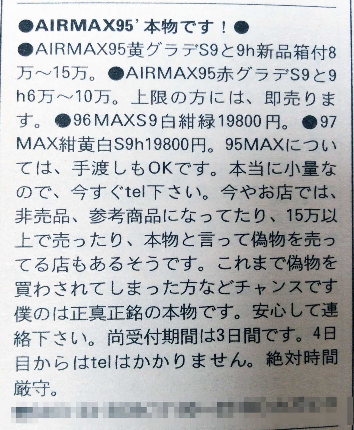 9hのhはハーフってことか。しかし写真もなく10万の靴を売ろうってのがスゴいな (笑)。本物かどうかすら怪しいじゃないの