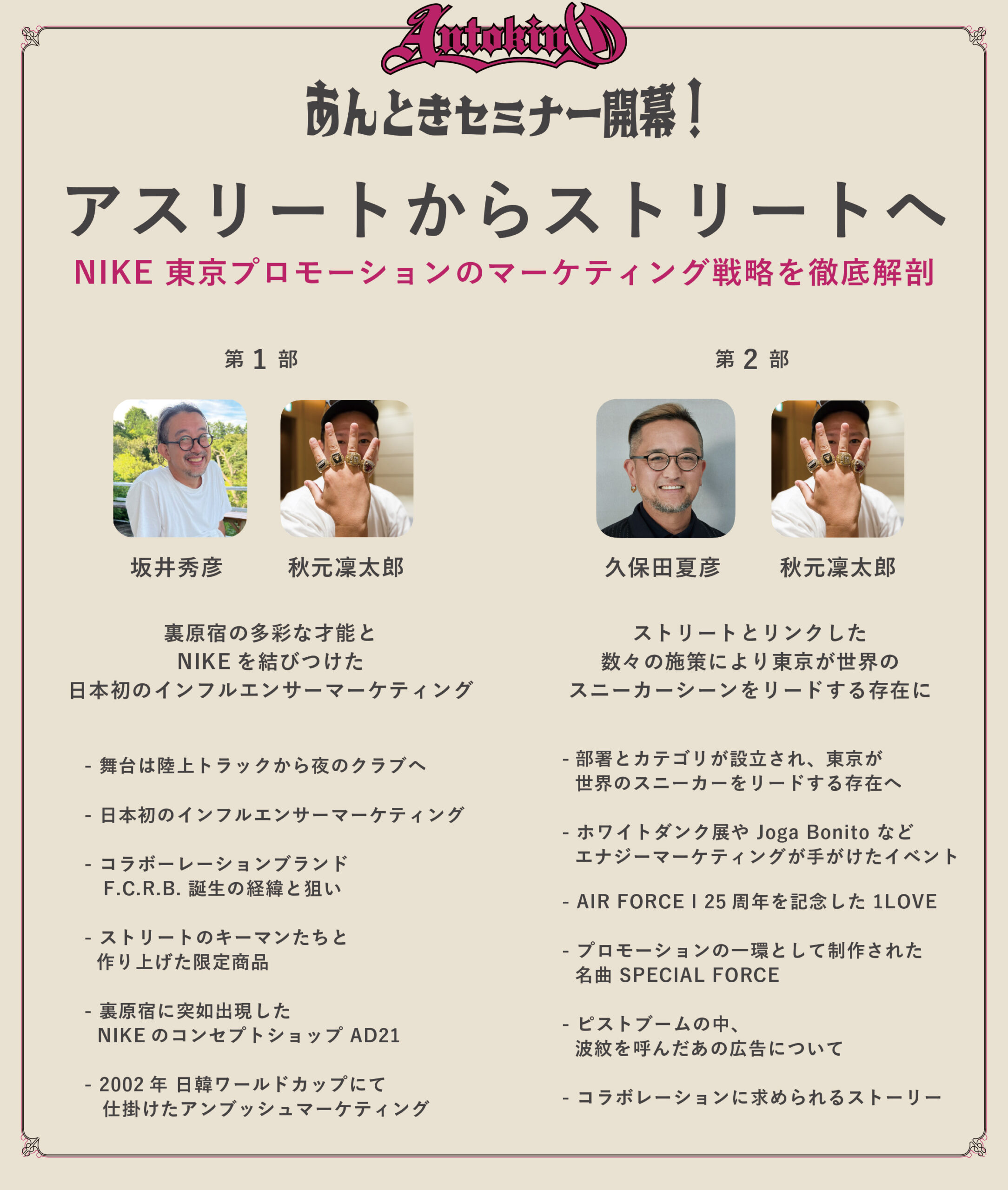 1部と2部に分けて数々の別注モデルの秘話、日本初 ( !? ) となるインフルエンサーマーケティング、AIR FORCE I 25周年記念の限定ショップ、NITRO MICROPHONE UNDERGROUND との楽曲制作など、ストリートカルチャーとリンクしながら実施された数々の施策をマーケティング視点で深掘りしていきます。