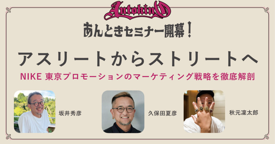 第一回目にご登壇いただくのは、数々の伝説的な施策によって東京をスニーカーの中心地に変えた NIKE 東京プロモーションに所属していた、坂井さん、久保田さん、秋元さんのお三方。