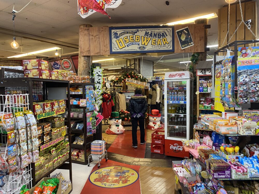 古着コーナー入り口。手前は家族でエンジョイできる駄菓子屋さんコーナー。