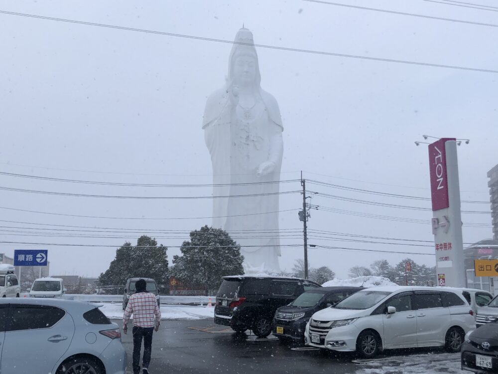 パーキングに車を停めて、振り返ると突如出現した巨大仏像に一同ビビる。通称、仙台大観音なる観音様で高さはナント100メートル。怖い!