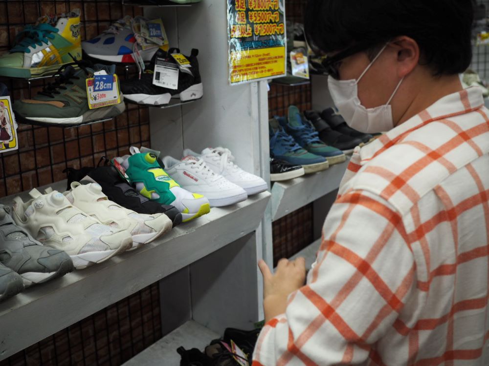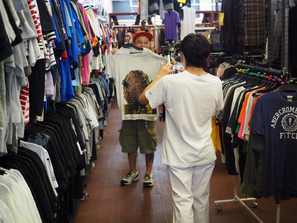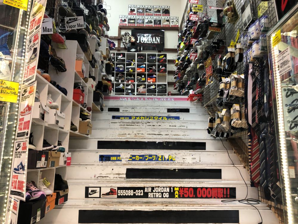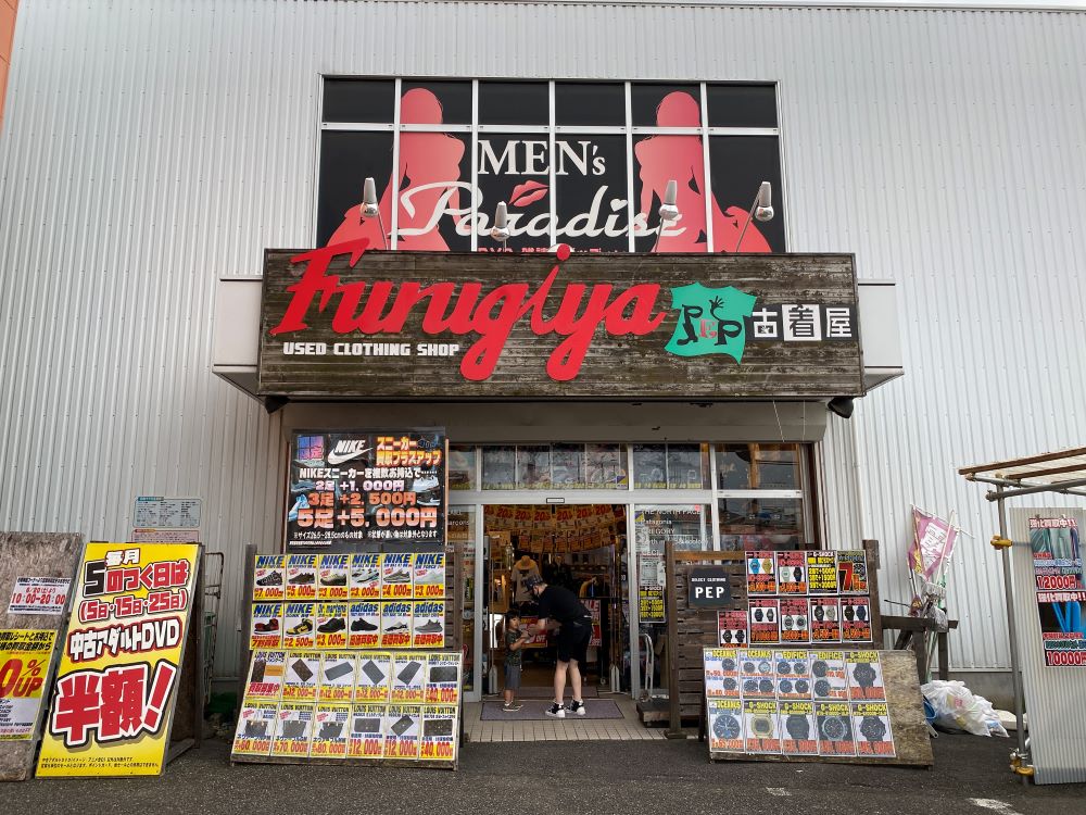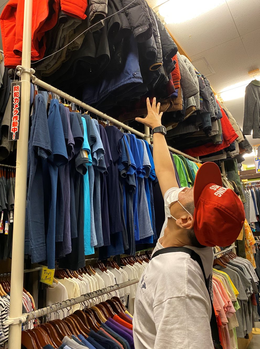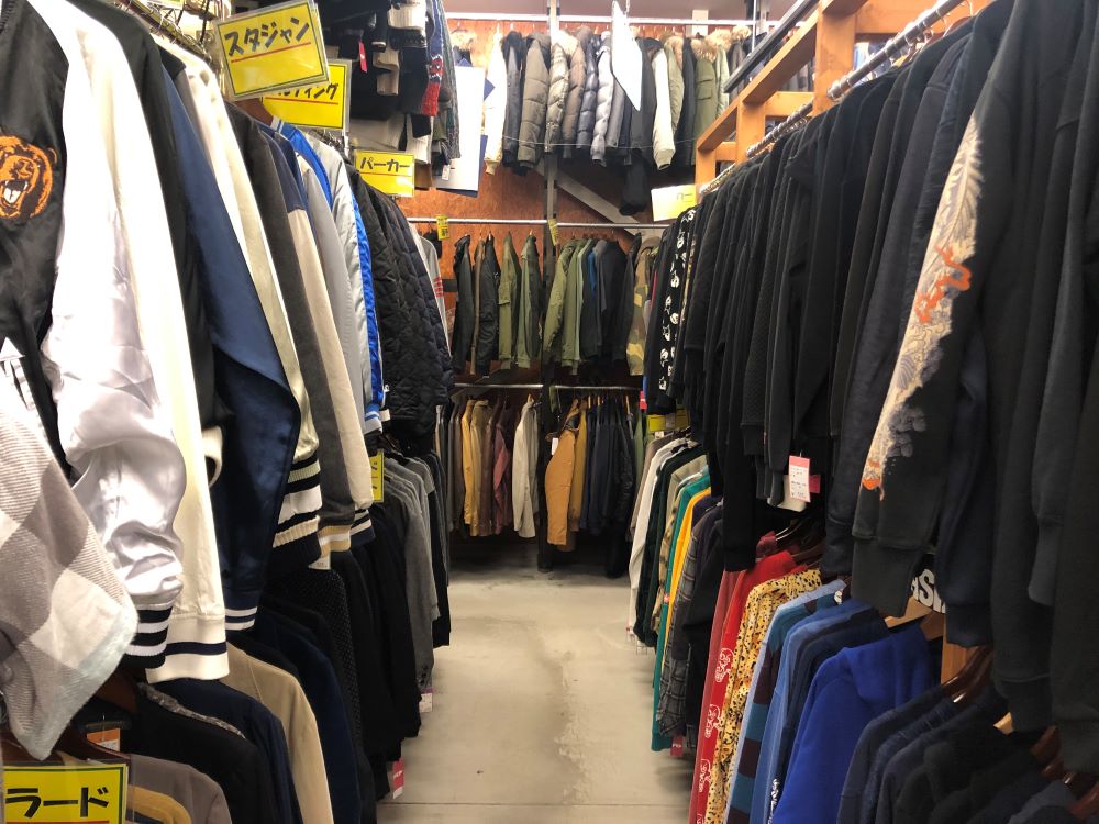 お次は、静岡鑑定団八幡店へ。入り口やフロアが複雑に絡み合うダンジョンのような店舗で、古着フロアのエントランスは裏口にあたる場所にアリ。