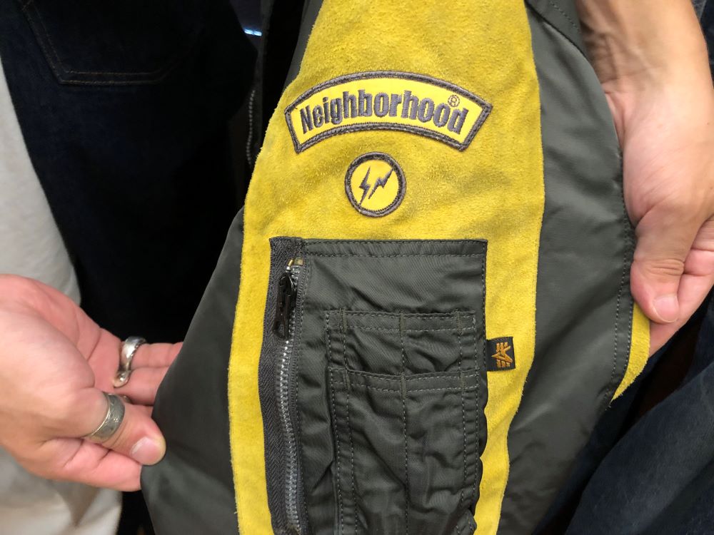 ネイバーフッドとフラグメントのコラボMA-1。ボディはアルファを使用。フラグメントのMA-1といえば、袖に特徴あるのが定番ですが、これはポケット部分が切り替えに。