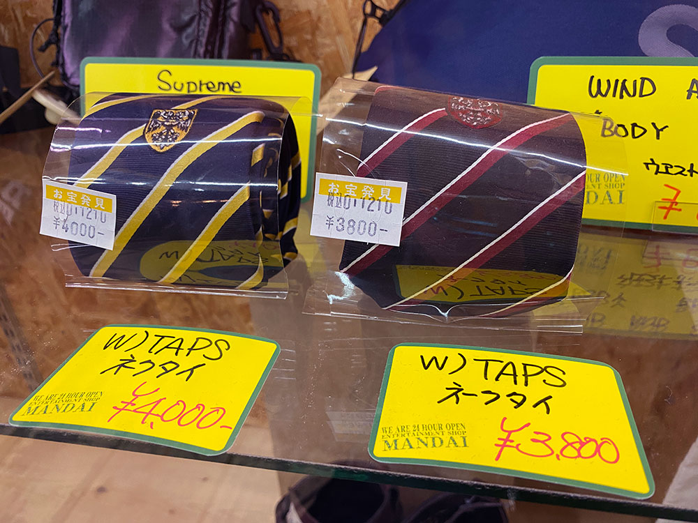 まず最初の出物は、ガラスケースに入ったダブルタップスのネクタイ。07年か08年に発売されたもので、左側の黄色は今でも大事に使ってます。右の赤も買おうとするも、このあと色々出すぎて買い忘れるという大失態。。。